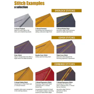 Med rullefall, flatlock, og coversøm med 5 tråder tilbyr Aspire et bredt spekter av dekorative effekter og sømkombinasjoner.