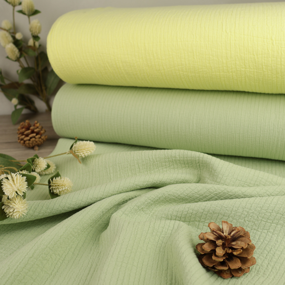 Et vevd bomullsstoff med den karakteristiske bølgede overflaten som kjennetegner seersucker. Den lette strukturen gjør at stoffet ligger litt fra huden, noe som gir en sval og behagelig følelse – perfekt til varme dager.