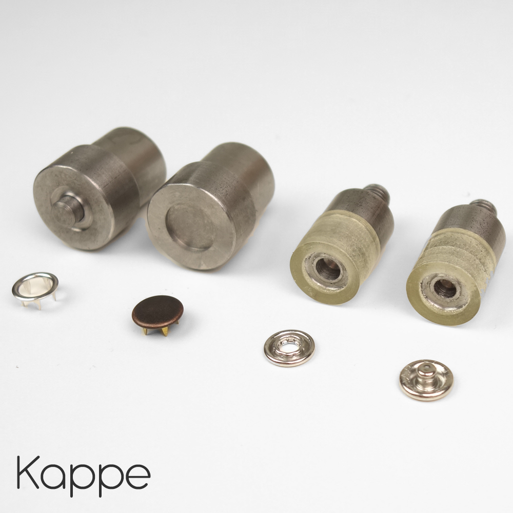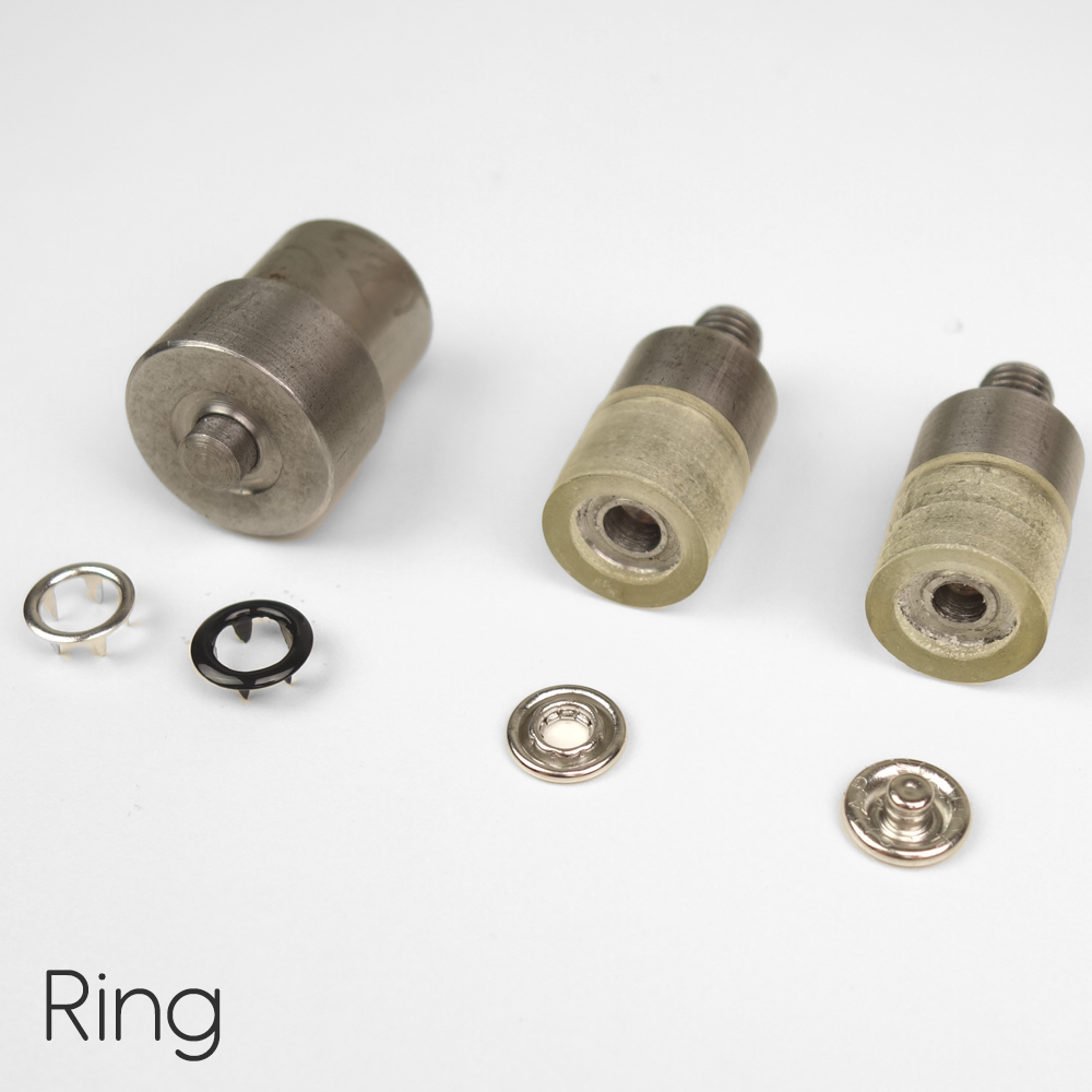 Inneholder innsatser til både ring- og kappe metalltrykknapper.